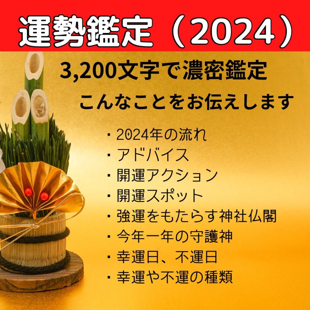 2024年の流れ、アドバイス(気を付ける事)、開運アクション、開運スポット、強運をもたらす神社や縁の深い神様、幸運日と不運日、こんな幸運が訪れる、こんな不運を警戒